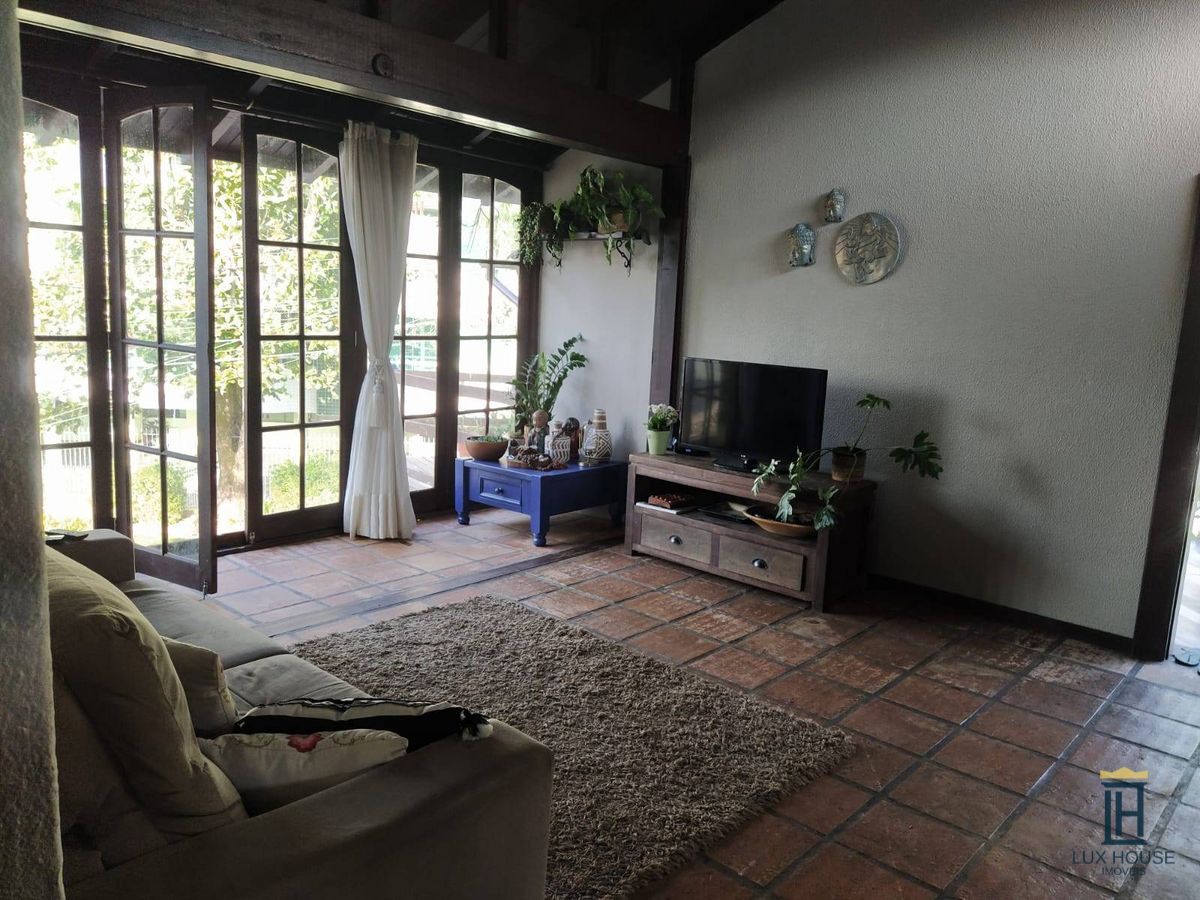 A casa principal com 4 quartos, 1 suíte, ampla sala de jantar, integrada com cozinha, sala de estar, lavanderia, churrasqueira, 1 banheiro, duas grandes sacadas, fogão a lenha e pequena piscina.